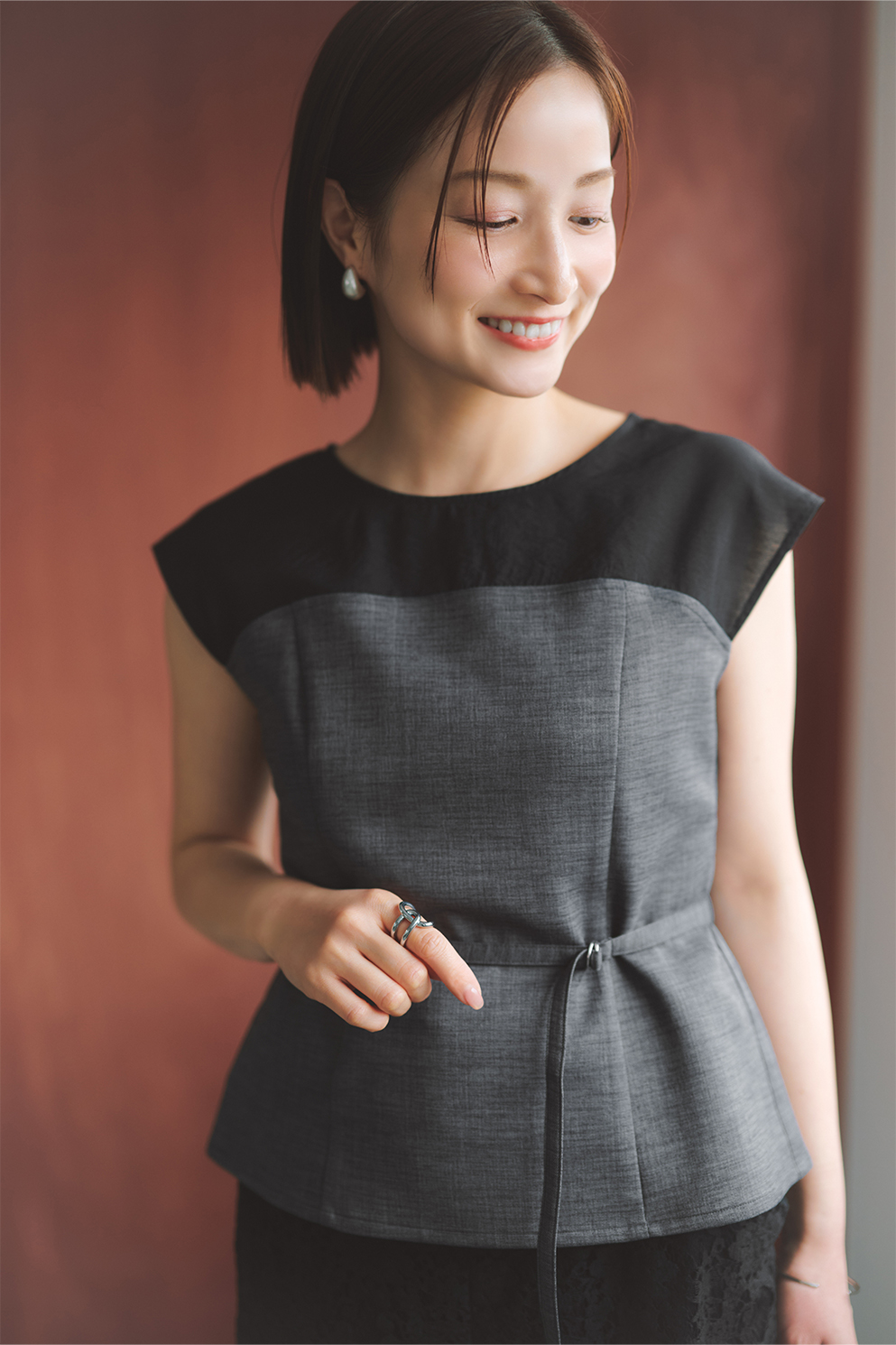 メリハリのあるバイカラーブラウスに、顔周りと揃えた