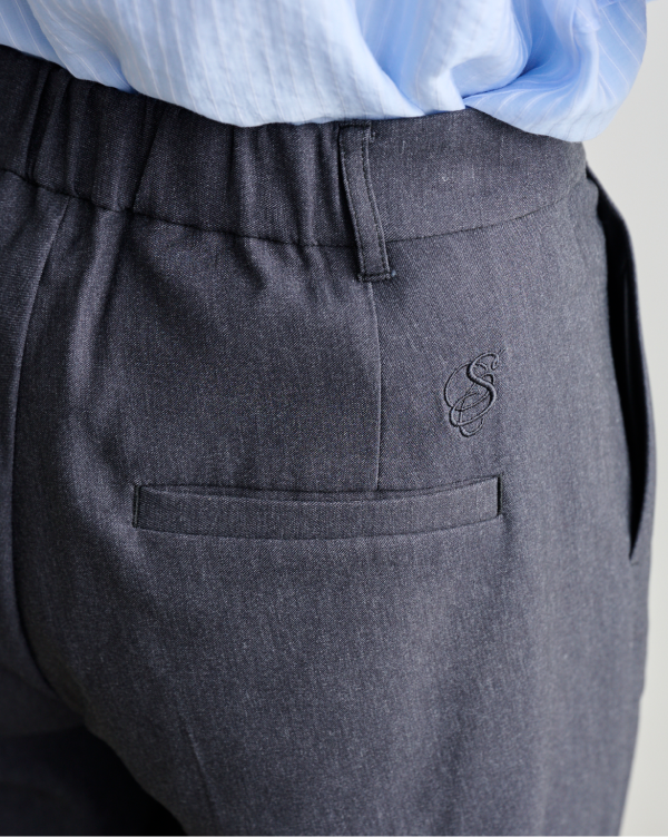 ヒップが高く見えるよう、後ポケットの位置にもこだわっています。さりげなく入った「S」の刺繍が、バックスタイルのポイントに。