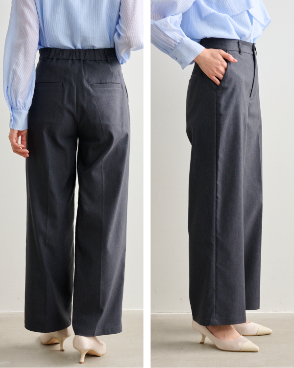 後ろウエストはゴム仕様ながら、ギャザーを少なめにすることでヒップラインをきれいにキープ。