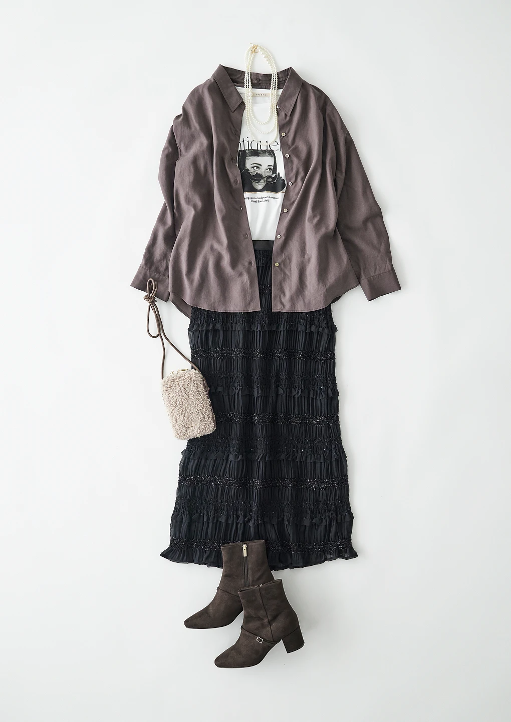 ディテールを詰め込んだシャツ×ビスチェ×パンツのセット。ソフトな肌触りと落ち感のある素材で、