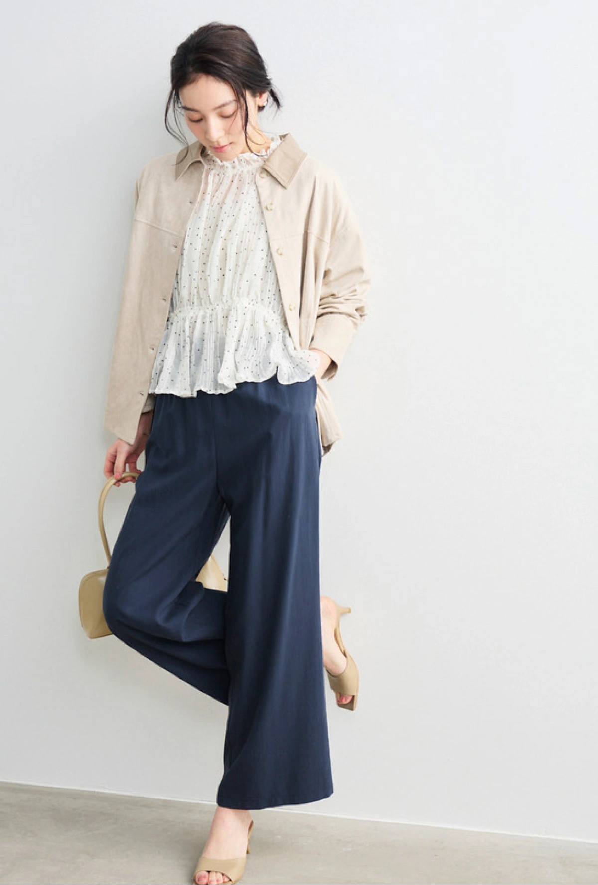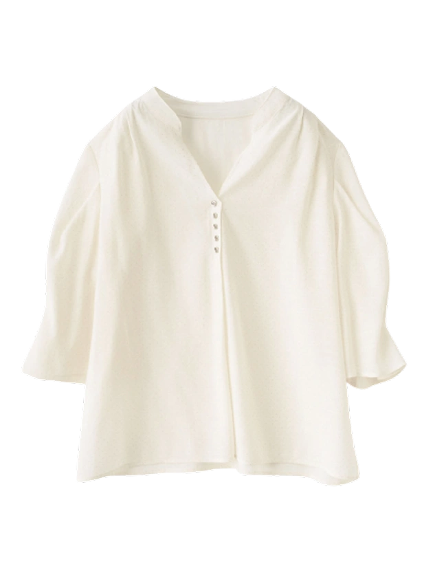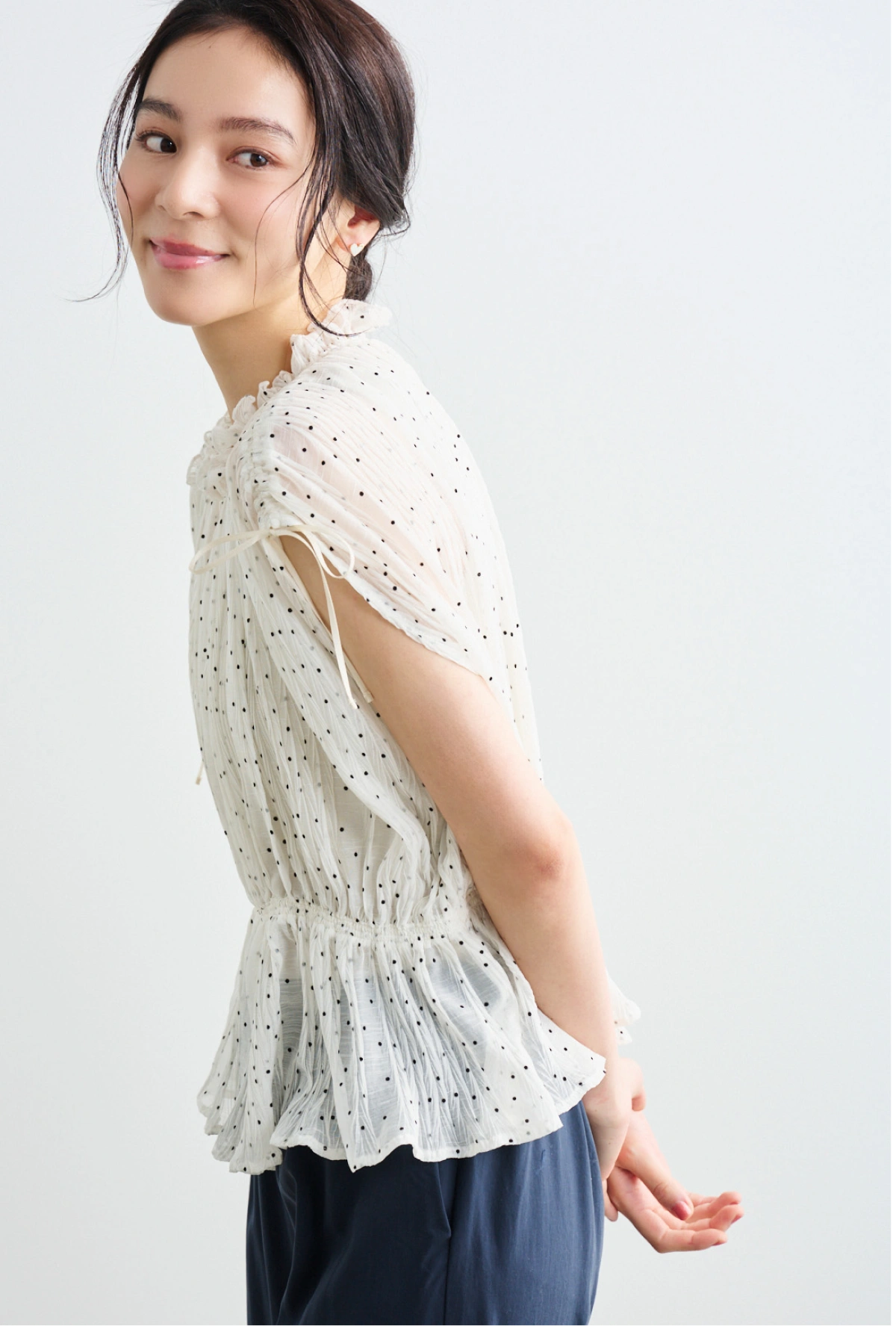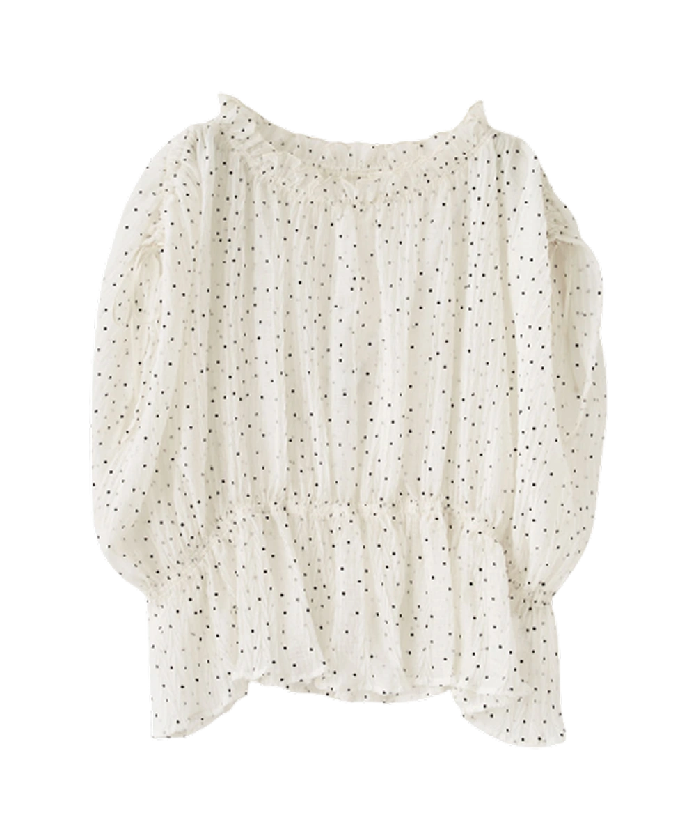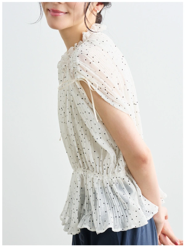 繊細なプリーツとドットが華やぐ、女性らしいブラウス。