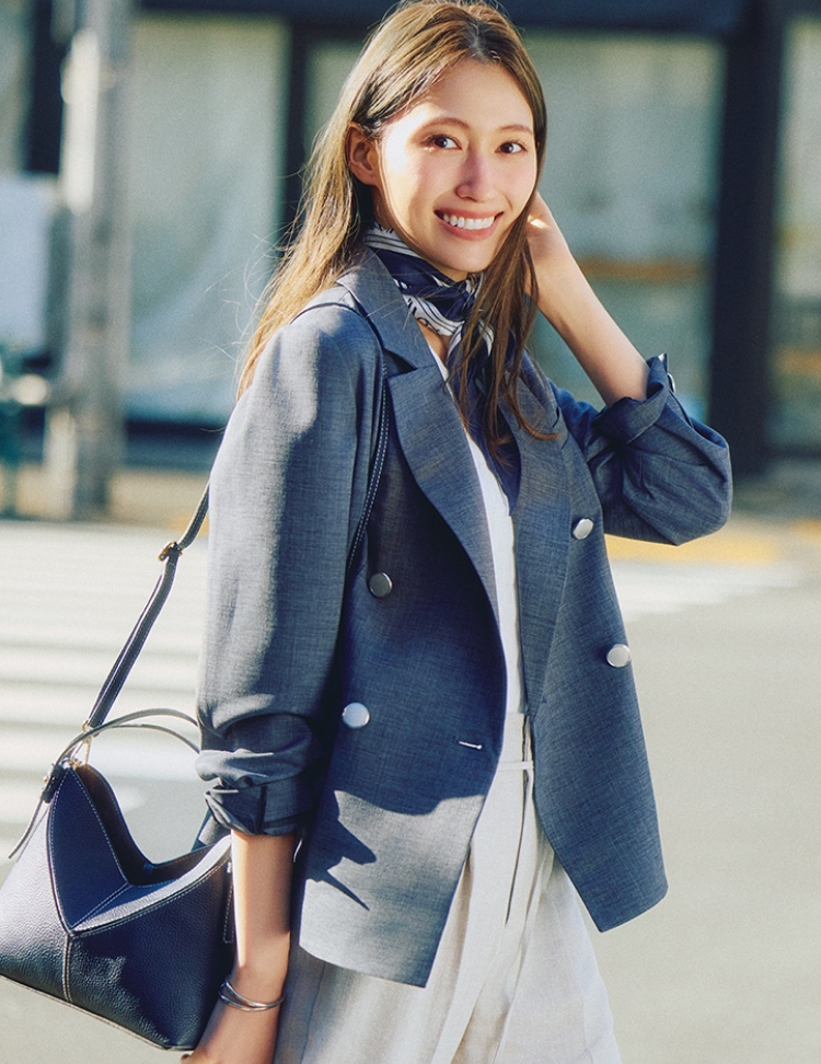 さらりと羽織るだけでサマになるボクシーなグレージャケットにセンタープレス入りのワイドパンツを合わせてより洗練度高く。UVカットや接触冷感機能を備えたドライタッチな素材で常に心地よく、クリーンな印象をキープできるのも嬉しい。