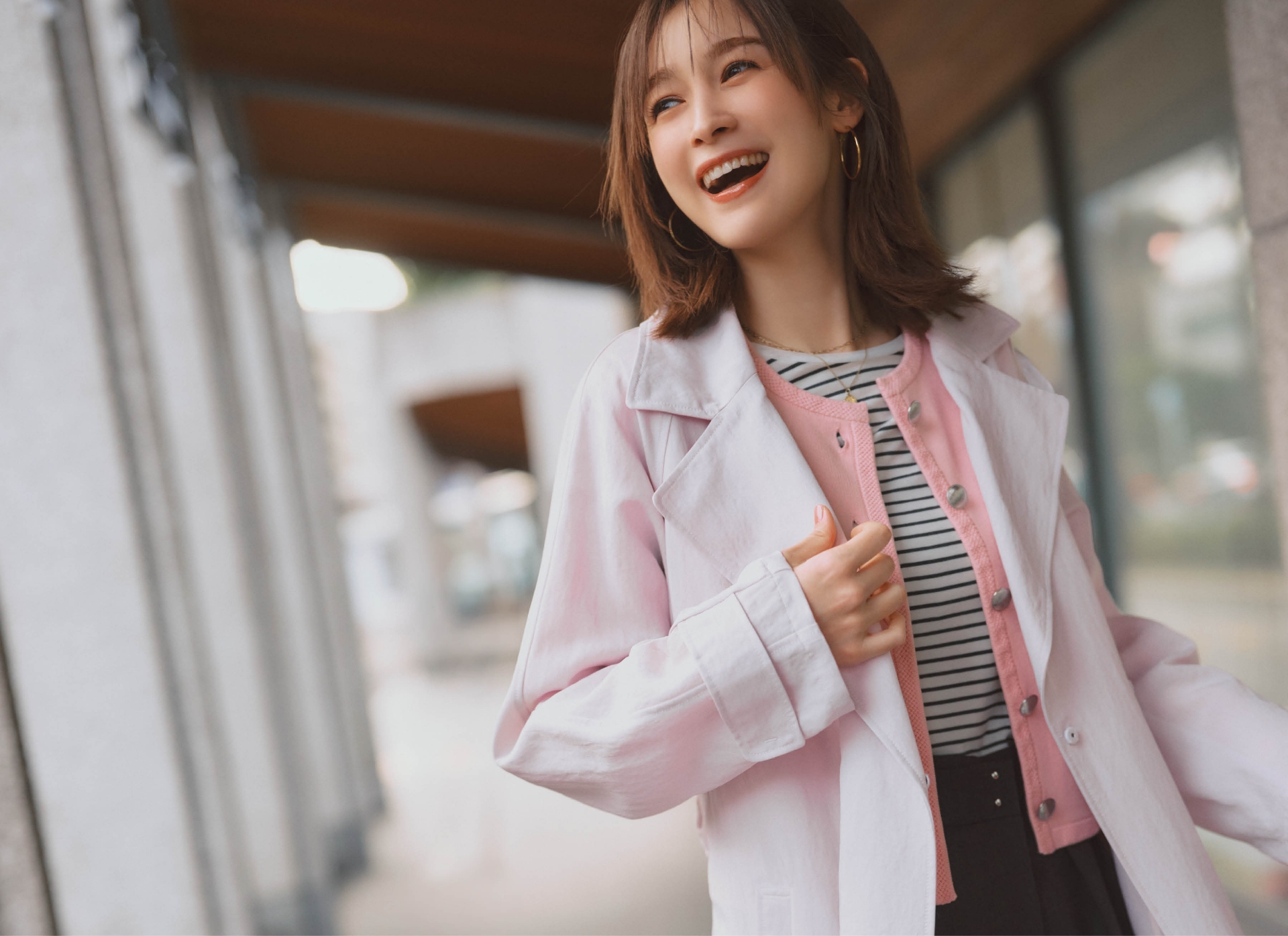 春の装いを更新する、淡い色調のピンクが主役。透明感のあるトーンで、艶のあるドライな素材がこの先の季節にちょうどいい。コートインは、少し濃度を上げたピンクのカーディガンとボーダートップスにワイドスラックス。きれい色をさらりとラフに着流した、リラックス感のあるムードが今の気分。
